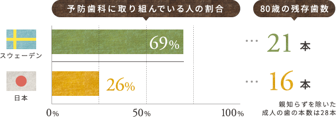 現に国全体の歯科医療の方針として「予防歯科」の考えを採用しているスウェーデンは、歯科疾患が世界で一番少なく、むし歯や歯周病を予防することができているため、80歳を迎えても大半の方が若い時とほとんど変わらない本数の歯の維持ができています。